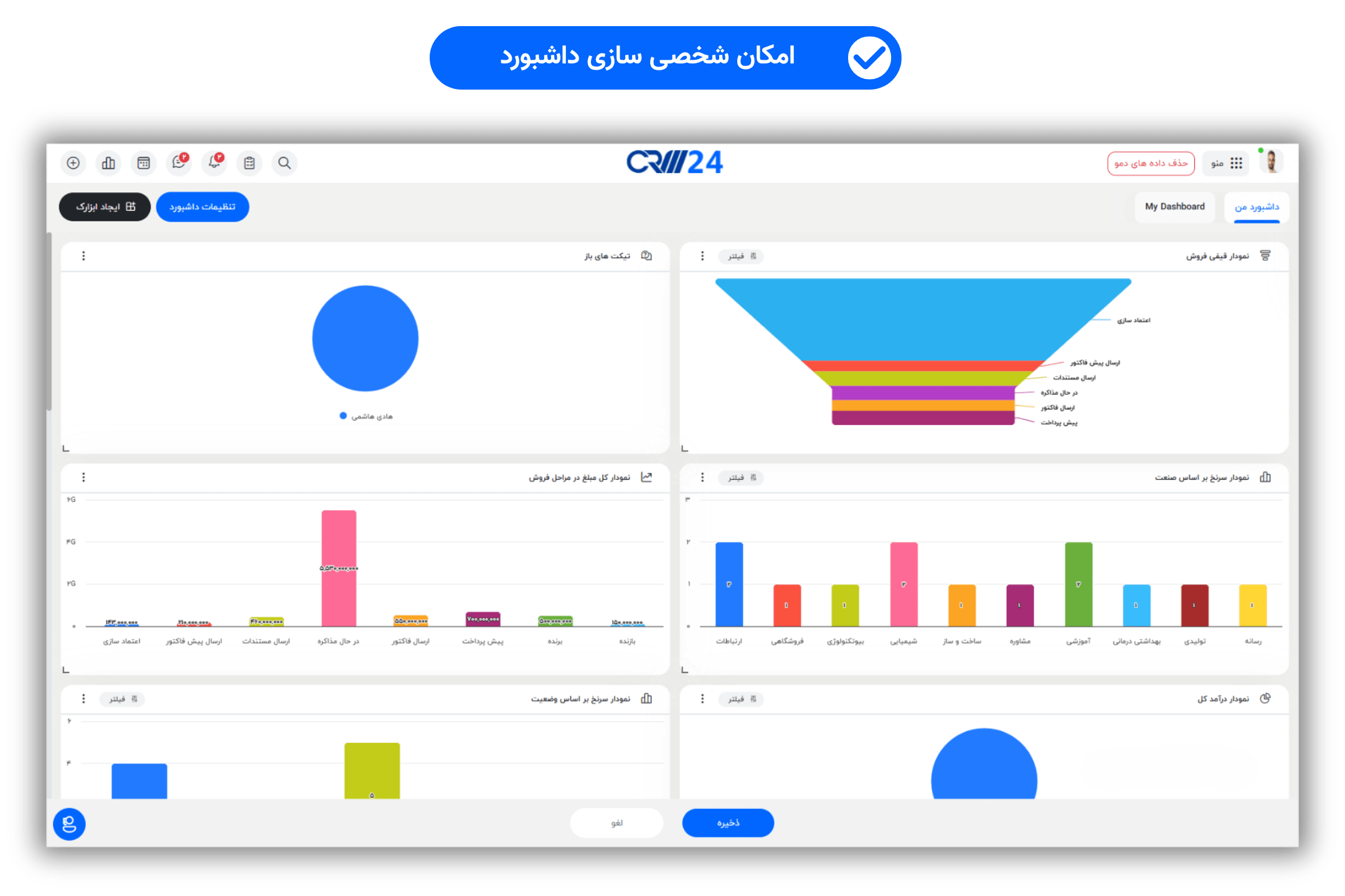 شما میتوانید برای بخشهای مختلف (فروش، بازاریابی، پشتیبانی، مدیریت پروژه و…) داشبوردهای مستقل ایجاد کرده و گزارشات نموداری و لیستی را در آنها پین کنید.