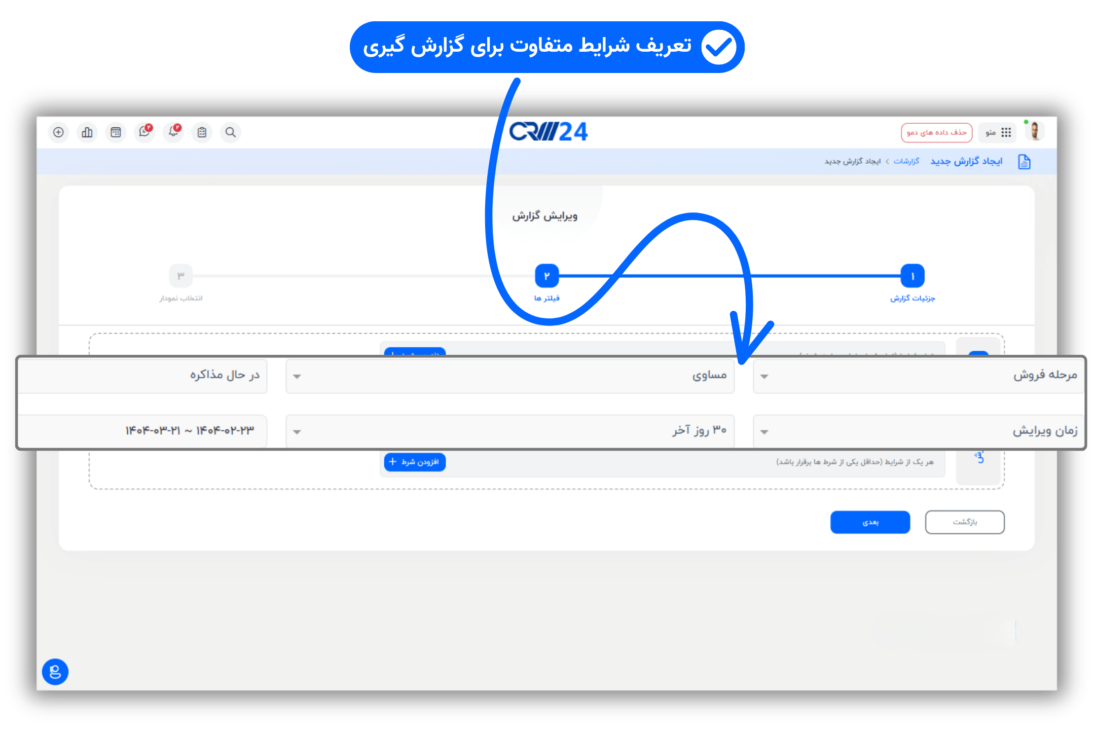 برای هر گزارش، میتوانید فیلترها و شروط مختلفی تعریف کنید.