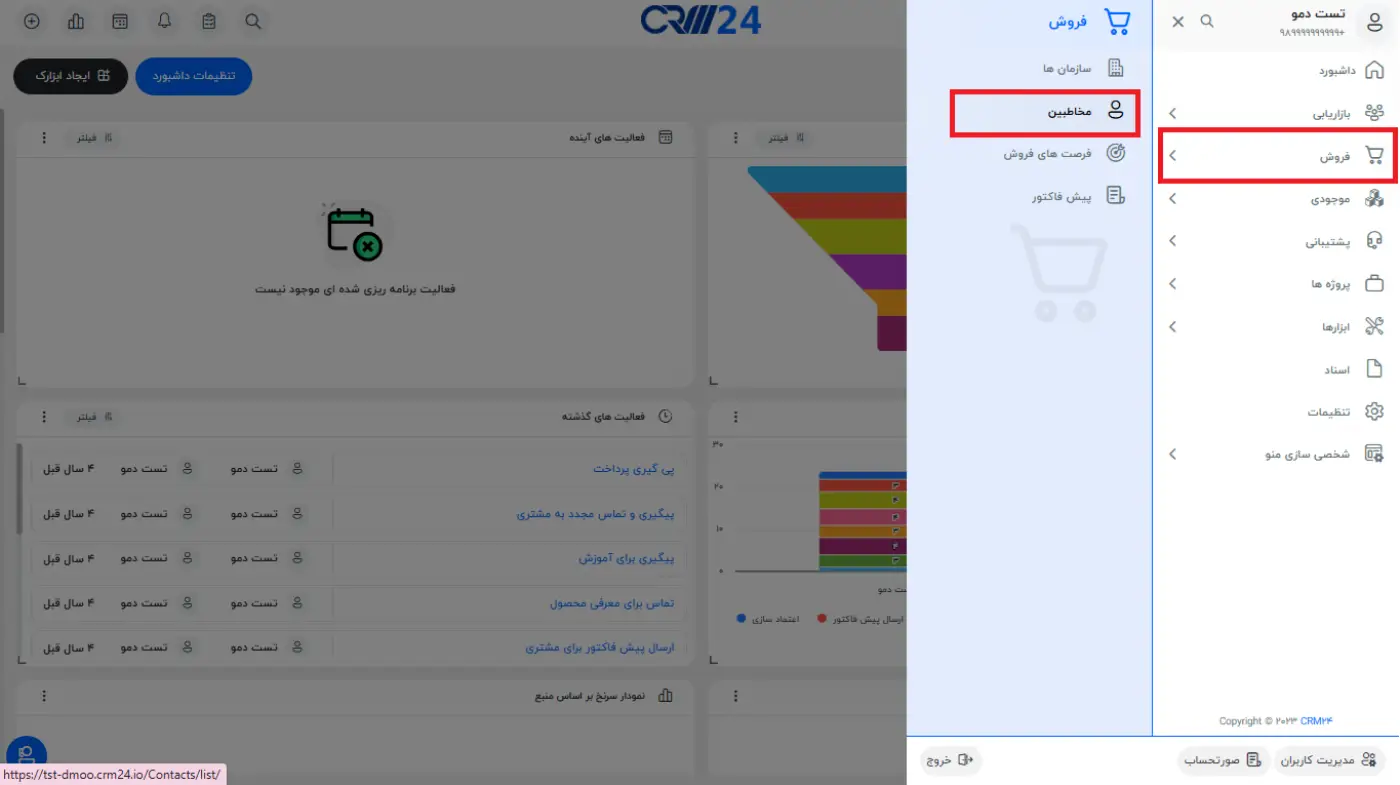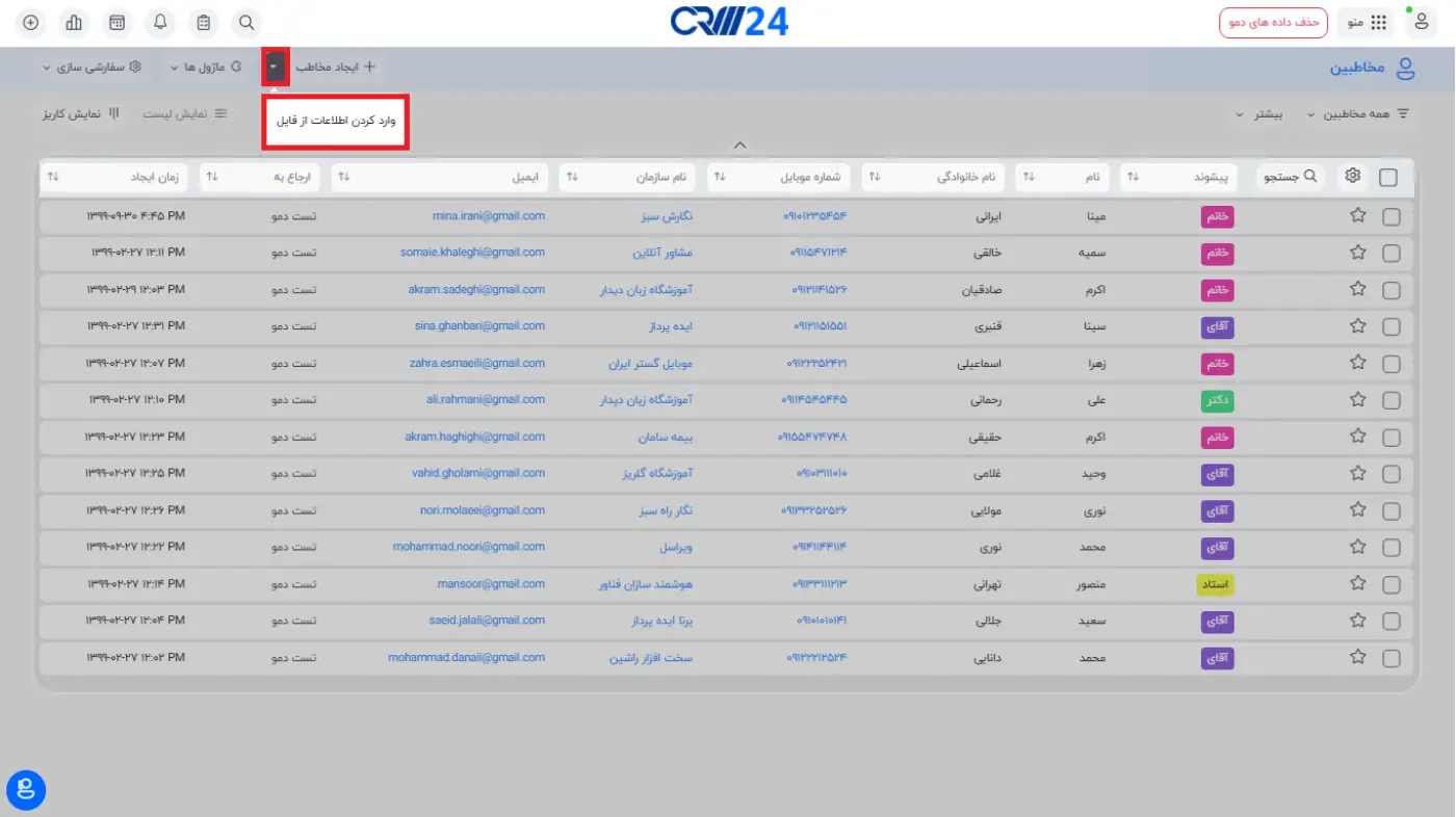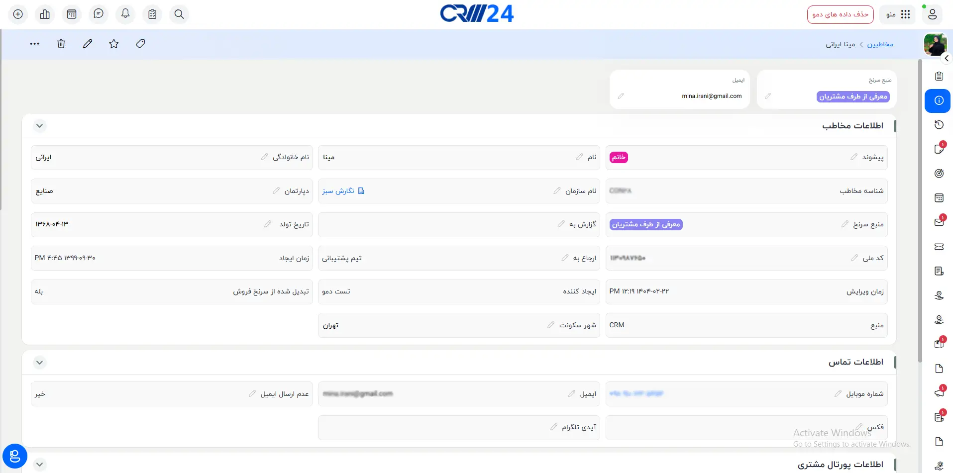 در ماژول مخاطبین CRM24، اطلاعاتی از تمام افرادی که با کسب و کار شما در ارتباط هستند (مانند مشتریان و تامین کنندگان) جمعآوری و ذخیره میشود.