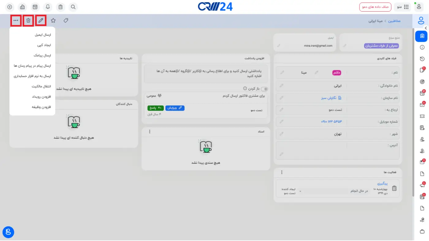 - عملیات روی رکورد مخاطب: با استفاده از آیکون (…) میتوانید اقداماتی مانند ارسال ایمیل، ایجاد کپی، ارسال پیام در پیامرسان، ارسال به نرمافزار حسابداری، انتقال مالکیت، افزودن رویداد و افزودن وظیفه را انجام دهید.