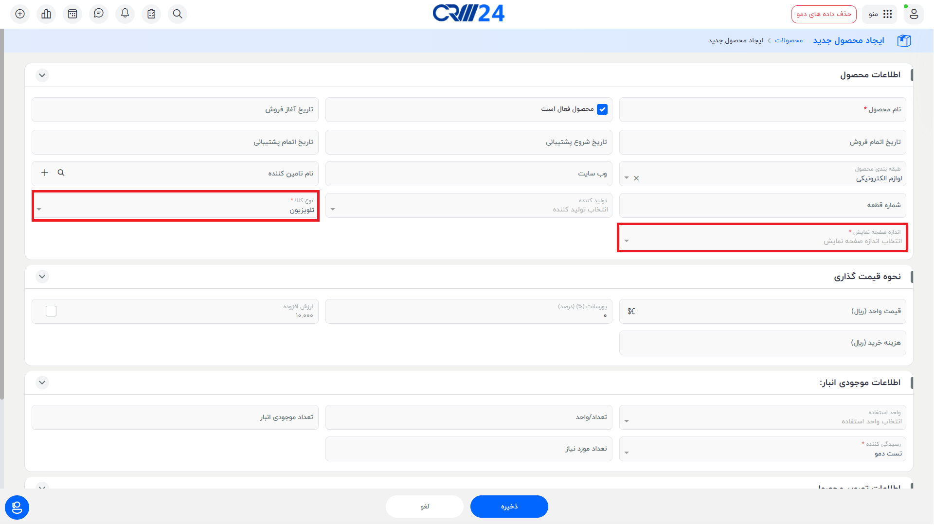 • تا زمانی که مقدار فیلد «طبقه‌بندی محصول» برابر با «لوازم الکترونیکی» نباشد، فیلد «نوع کالا» نمایش داده نخواهد شد.نمایش وابستگی های ایجاد شده در ماژول