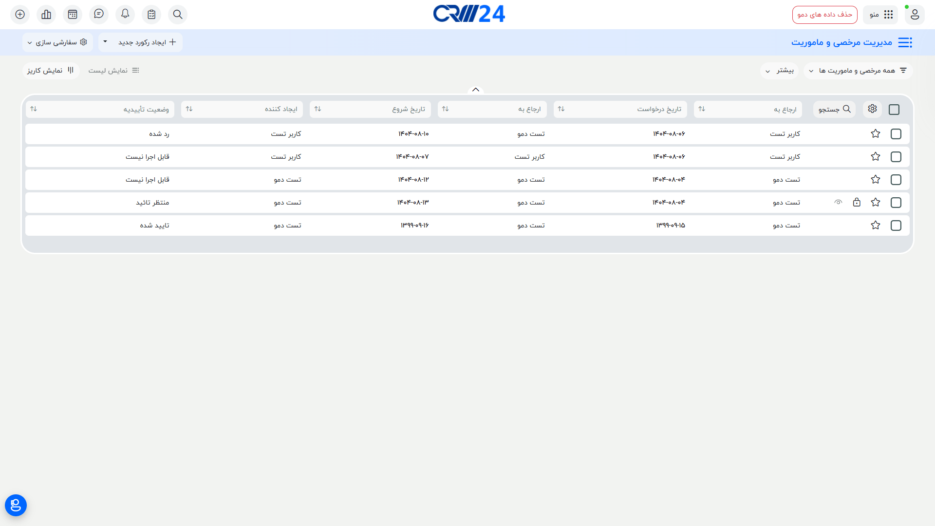 - ماژول مدیریت مرخصی و مأموریت در CRM24 یکی از ماژولهای کلیدی در بهینهسازی فرآیندهای سازمانی است.
